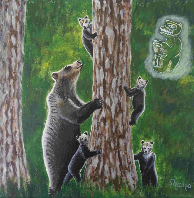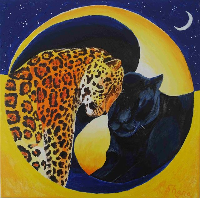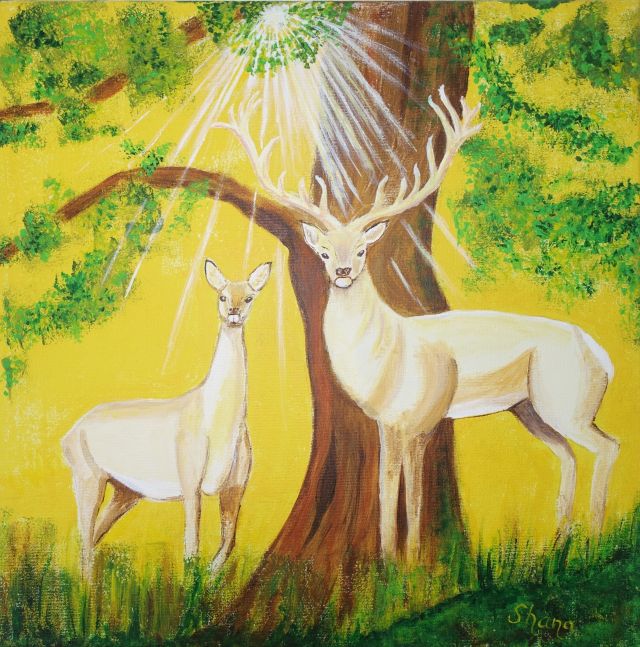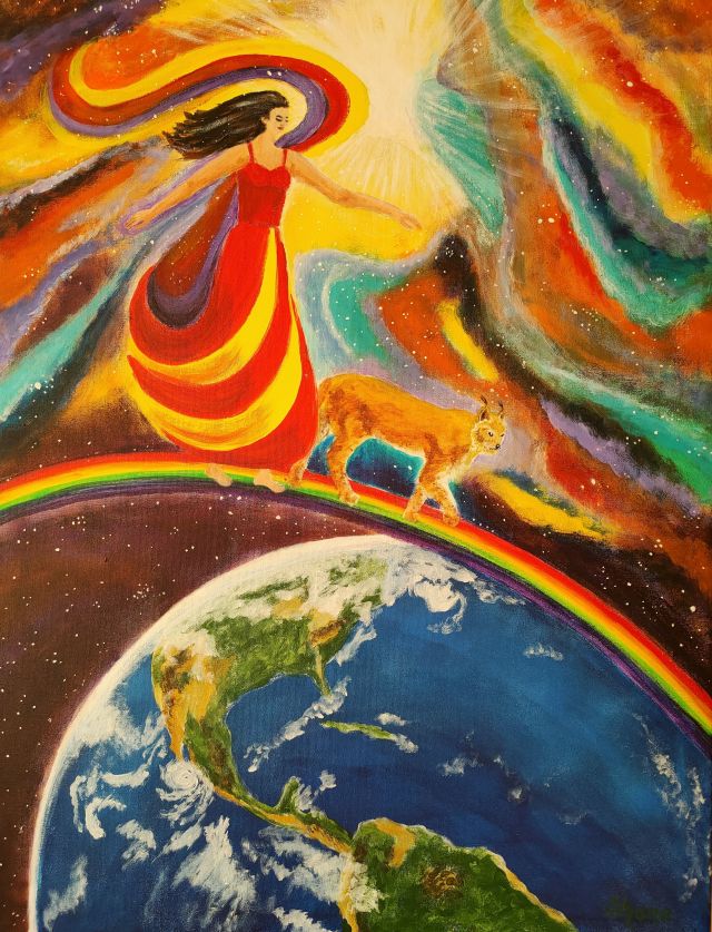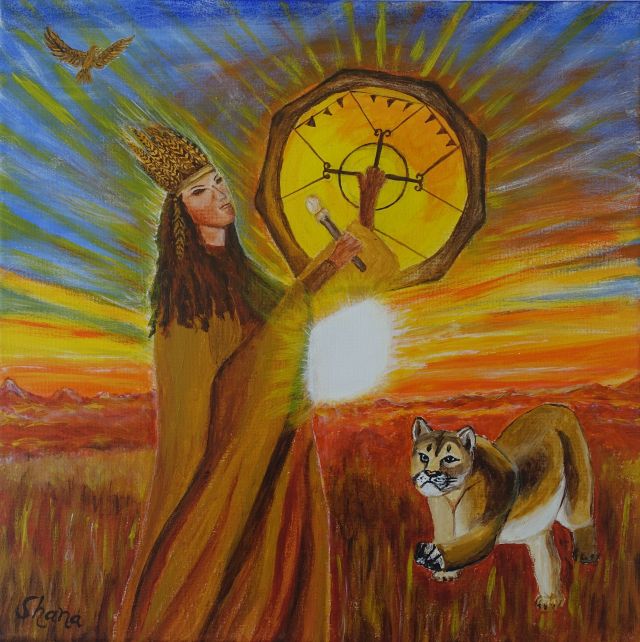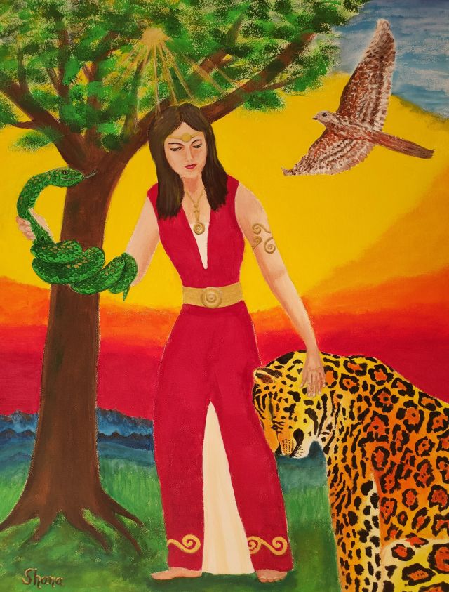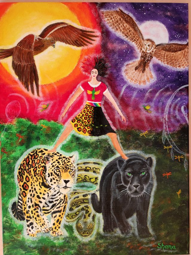 Dafür mache ich eine oder mehrere schamanische Reisen, die mir helfen, wichtige Aspekte deiner Seele zu erfassen und in bildhaft Form zu bringen. Ich frage meine Spirits, was gerade für dich und deine Entwicklung wichtig ist. Es wird mir gezeigt, welche Farben für dich heilsam sind, welche Inhalte dir Kraft und Heilung schenken, welche Tiere oder Helfer dich weiterbringen, welche Formen deine Entwicklung fördern. Dies bringe ich in Farbe und Form auf die Leinwand.